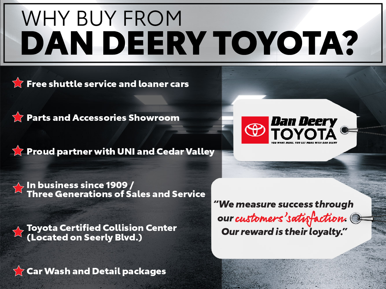 Welcome to the Dan Deery Toyota website, a fast and convenient way to research and find a vehicle that is right for you. Whether you are looking for a new or used Toyota car, truck, or SUV you will find it here. We have helped many customers from Waterloo, Des Moines, Cedar Rapids, Iowa City, Hudson, Jesup, Raymond, Gilbertville, Elk Run Heights, Evansdale, Waverly, Dike, Independence, La Porte City and Cedar Falls find the Toyota of their dreams!